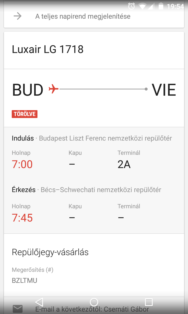 Este 8-kor pittyent a telefonom. Se’ chat, se’ email, se’ SMS. Mi ez a kis piros repülő ikon a bal felső sarokban? Hát ez. Járat törölve.
