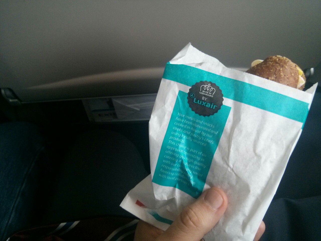 Ínycsiklandó Luxair szendvics, szezámmagos rozskiflivel, friss salátával és camamberttel, a háttérben hányózacskó.